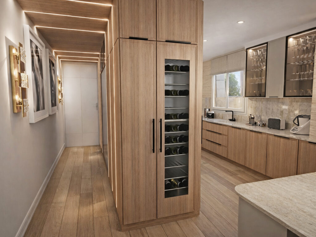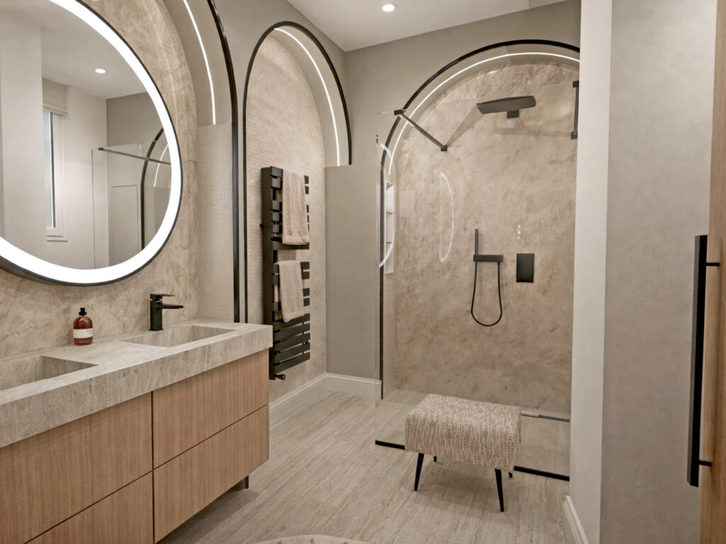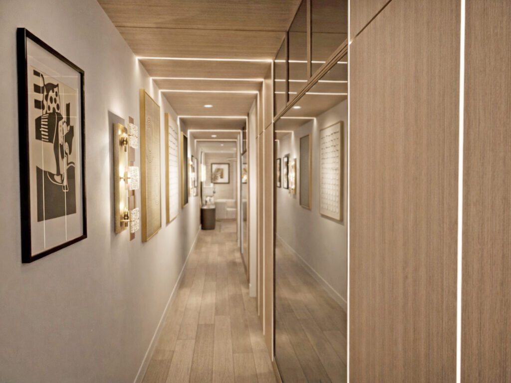 Notre plus grand challenge ? Un couloir monumental de plus de 30 mètres de long, scindé par deux imposants murs porteurs. Pour transformer cet espace de passage en un atout esthétique, nous avons dû faire preuve de créativité et d’ingéniosité. C’est ici que le jeu des matériaux, des textures et de la lumière prend tout son sens.