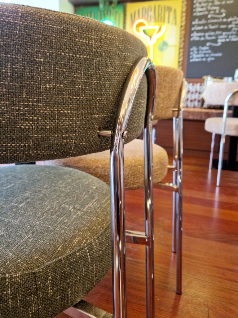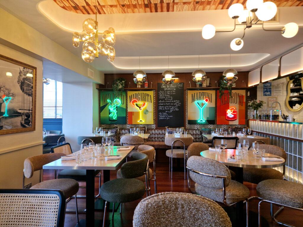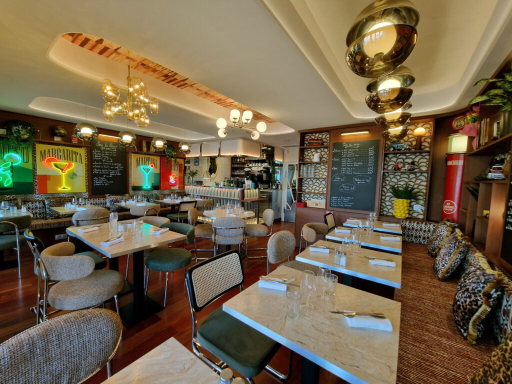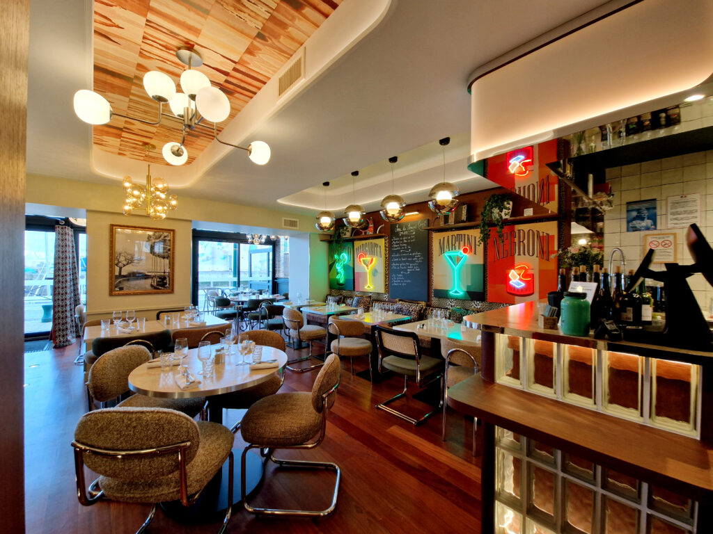 Kasia et Julien, gérants de l’établissement depuis 2017, ont sollicité Studio Vesta pour repenser intégralement leur restaurant. Idéalement situé sur le port des Sables-d’Olonne, le lieu nécessitait un second souffle pour se moderniser et, enfin, être en parfaite adéquation avec son nom : « Le Vintage ».